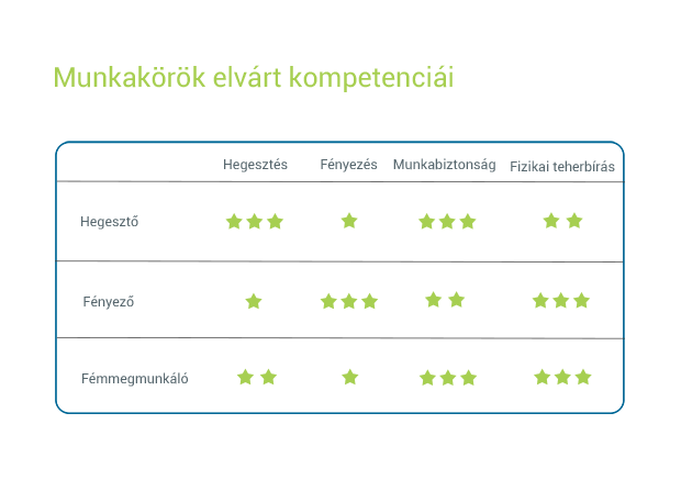Hiányzó kompetenciák: ezáltal láthatóvá válik, hogy az adott vállalatnál meglévő munkakörök kompetencia-készlete miben egyezik meg és miben tér el.