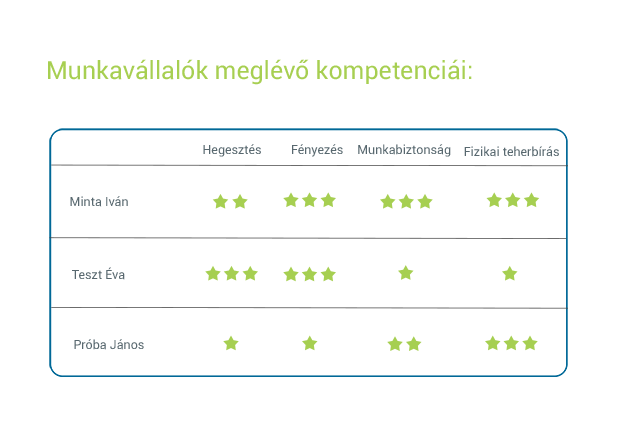 - -lekérdezés arra vonatkozóan, hogy adott munkakört kompetenciáik, képességeik alapján mely (jelenleg más munkakörben dolgozó) kolléga tudna betölteni?